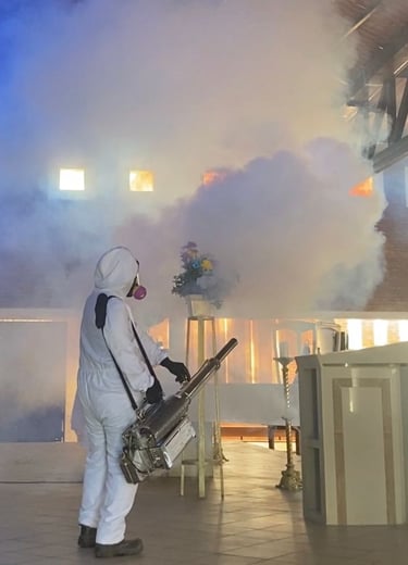 Sistema de aplicación de plaguicidas mediante microgotas en suspensión, que permite una cobertura uniforme y eficiente en áreas internas y externas, alcanzando zonas de difícil acceso para un control efectivo y duradero de plagas.